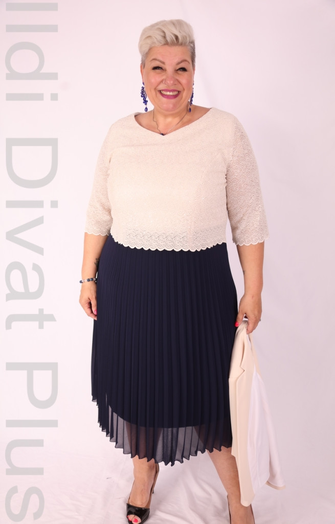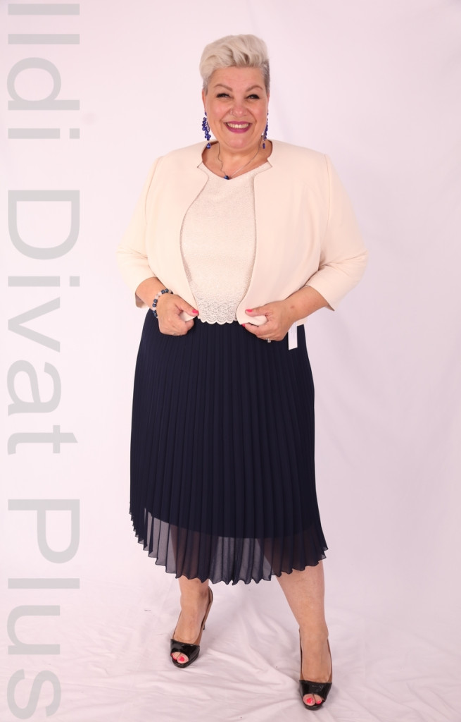 Agis beige-kék pliszírozott aljú apró csipke mintás tetejű tuha+ beige blézer.