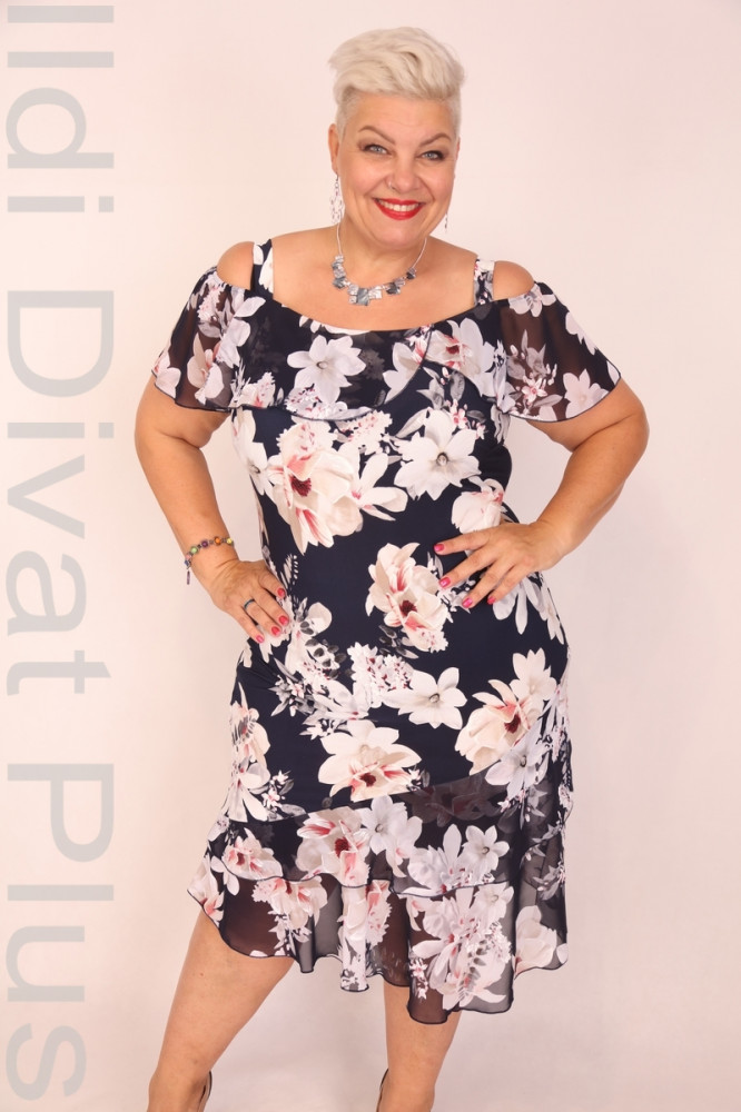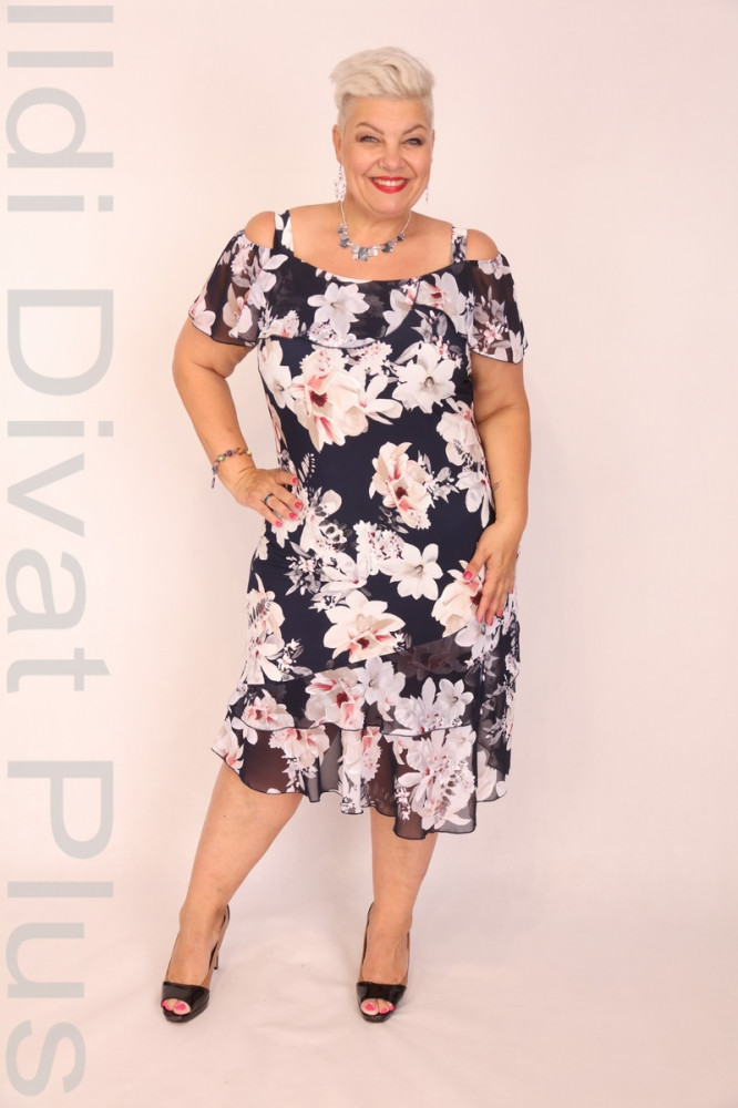 Ajso sötétkék alapon virágmintás, vállán nyitott, alján muszlin anyagú, enyhén lefelé bővülő.