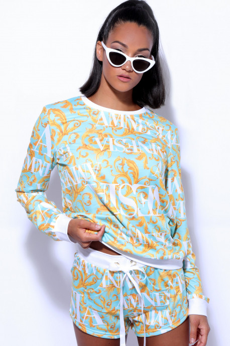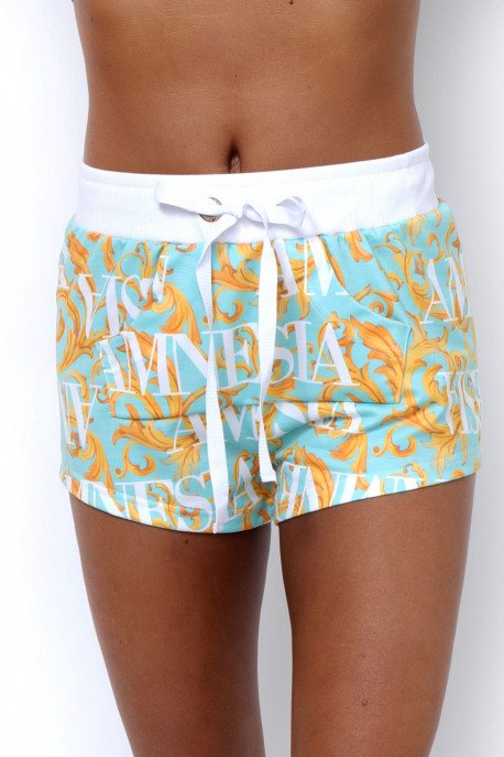 Amnesia türkiz-fehér-sárga mintás, derekán gumírozott és kötős, zsebes, mindennapi rövidnadrág.