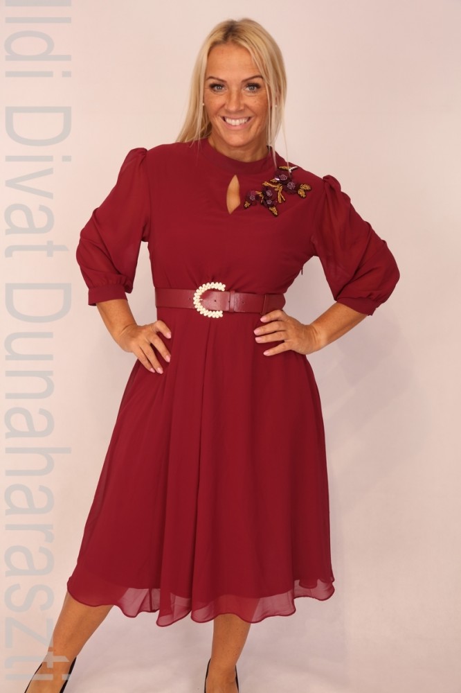 Annavero padlizsán színű, csepp kivágott, derekán öves, alsó részén muszlin rátétes, A-vonalú ruha.