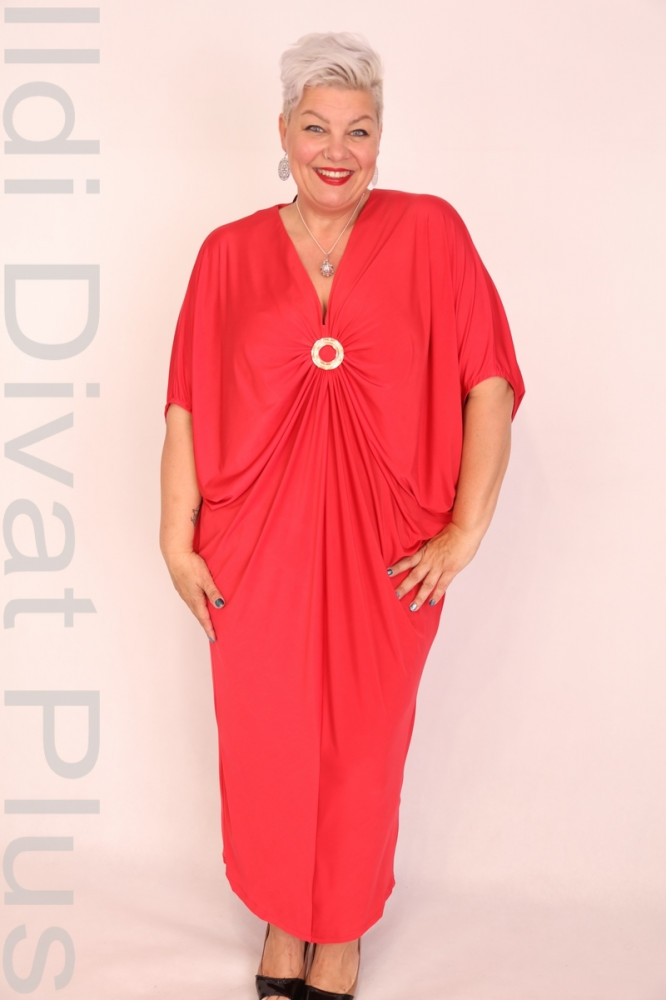 Anne Scarlet piros színű, V-kivágott, mell részén díszcsatos, húzott, lezser fazonú maxi ruha.