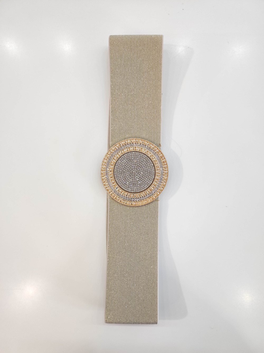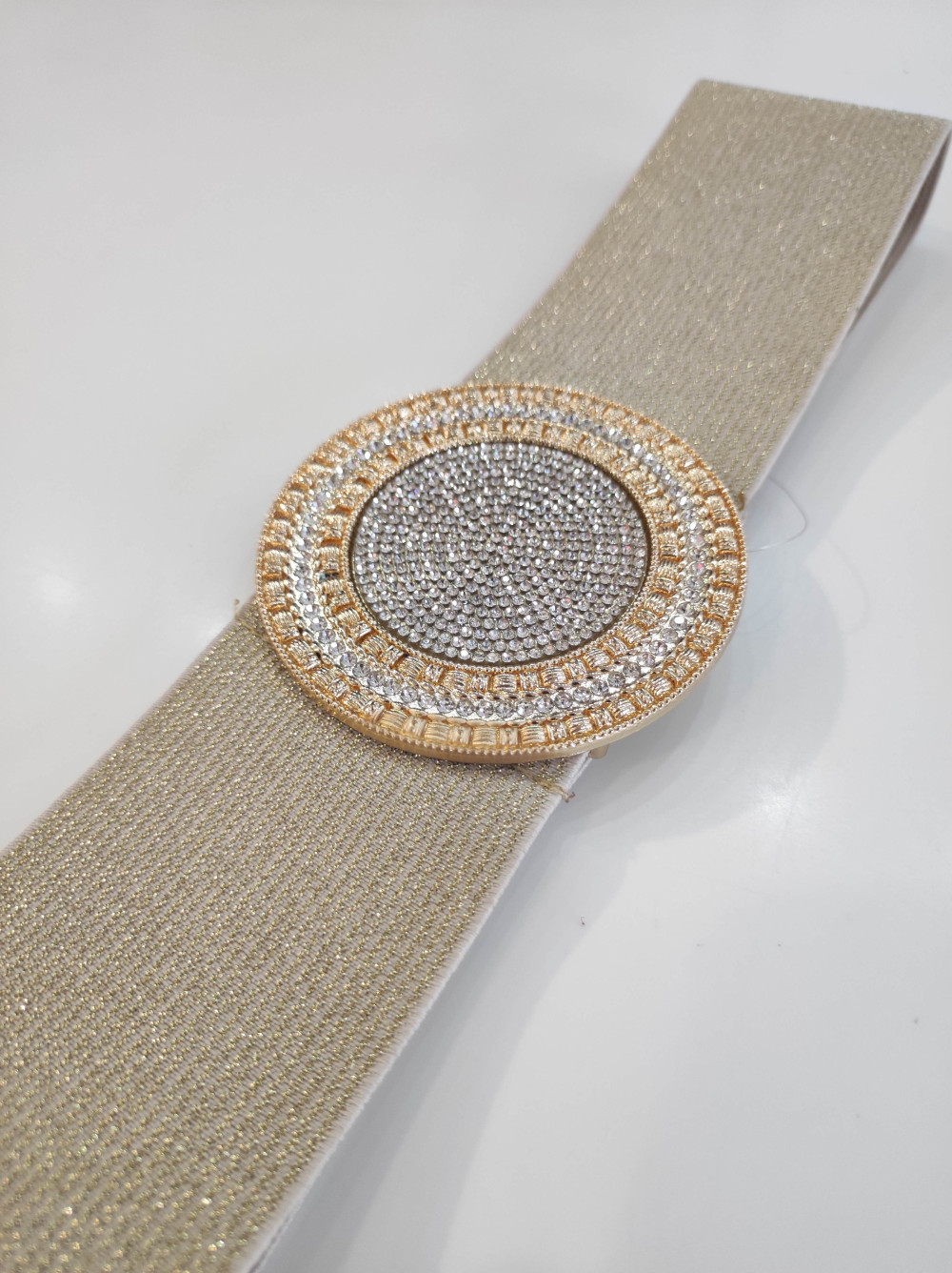 Arany színű, strasszos, elején kapcsos, gumis öv.