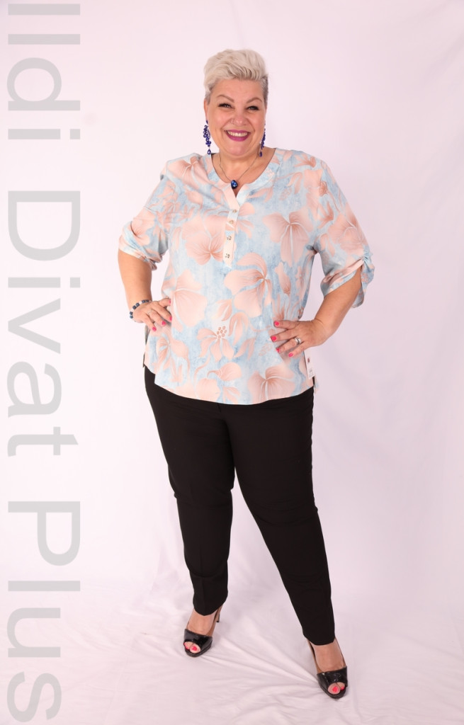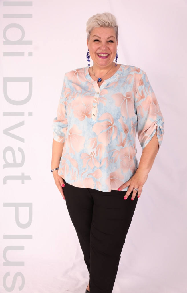 Attane kék-beige mintás nyakán gombos muszlin blúz.