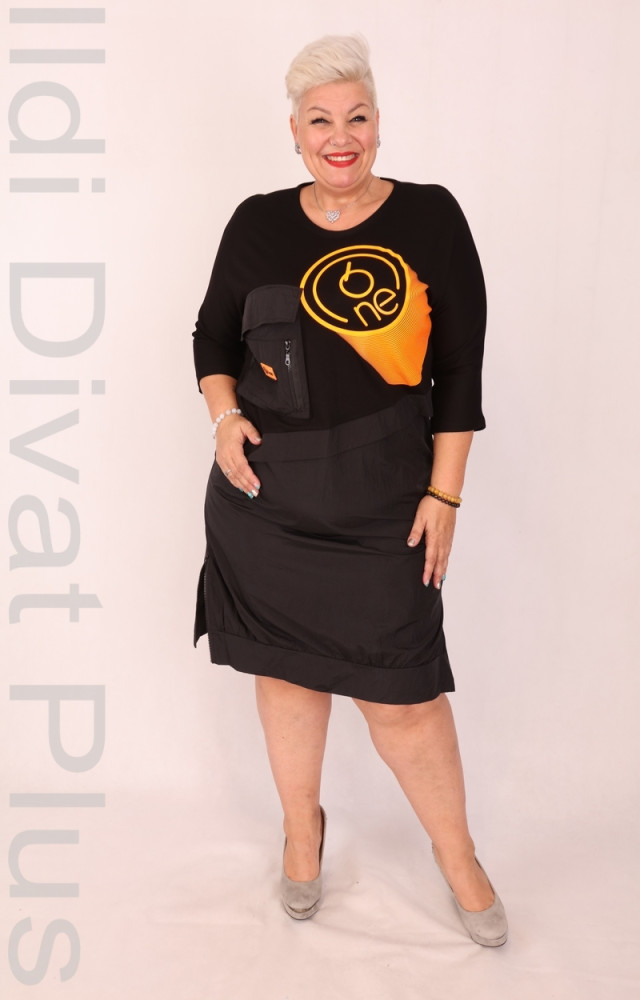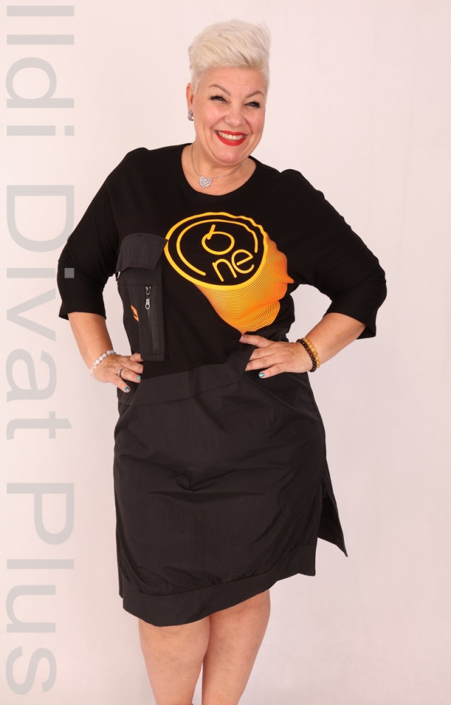 B-One fekete alapon narancssárga mintás, kerek nyakú, zsebes, sliccelt, egyenes fazonú ruha.