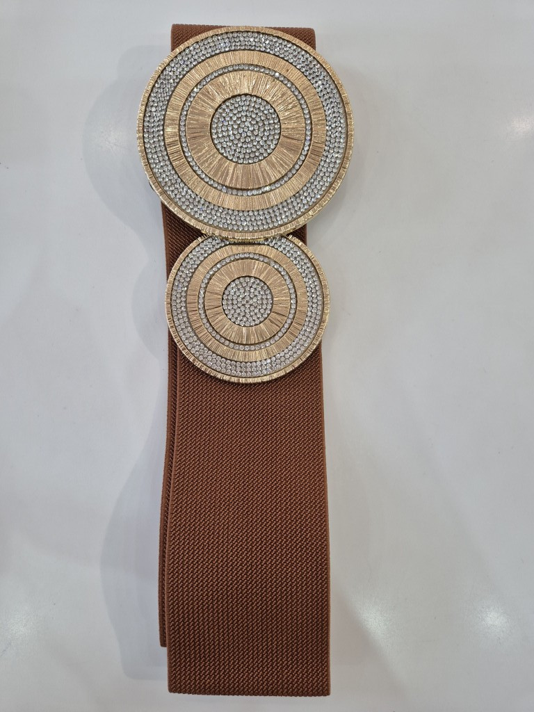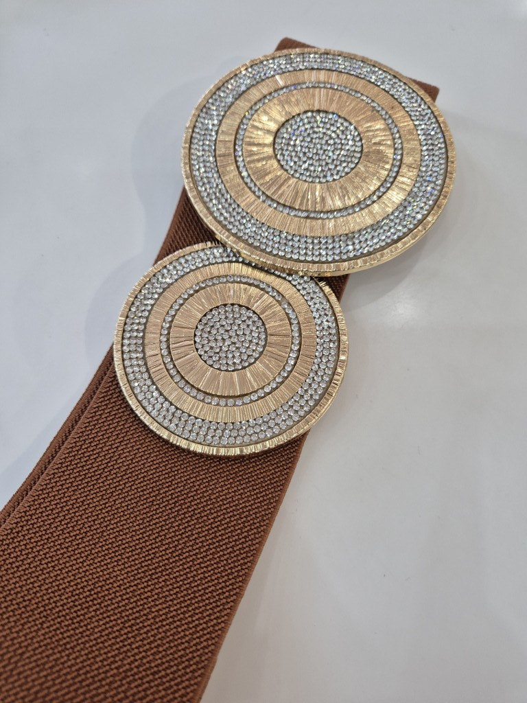 Barna színű, strasszos, elején kapcsos, gumis öv.