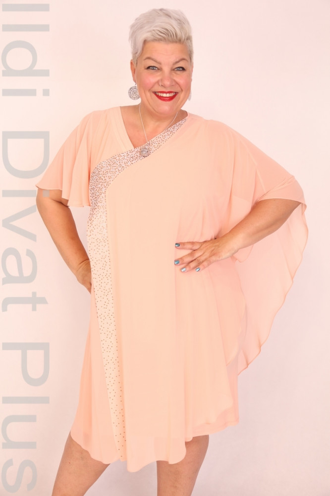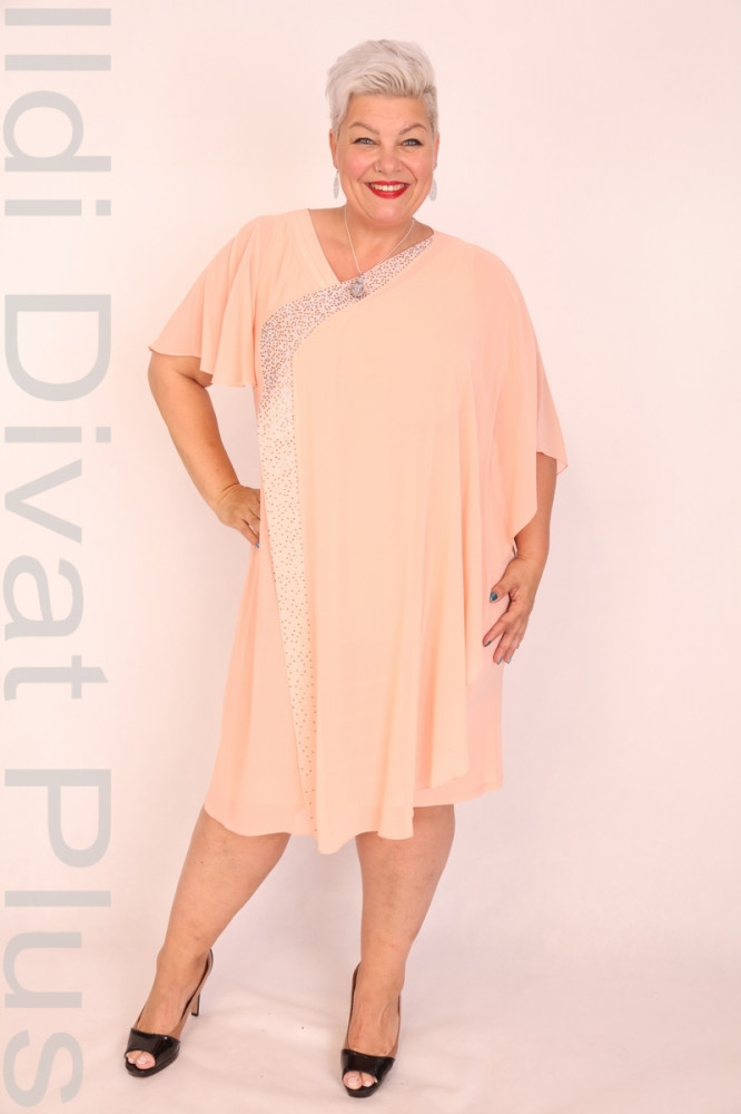 Baroslis barack színű, V-kivágott, átlapolt, muszlin anyagú, strassz díszítéses, lezser fazonú ruha.