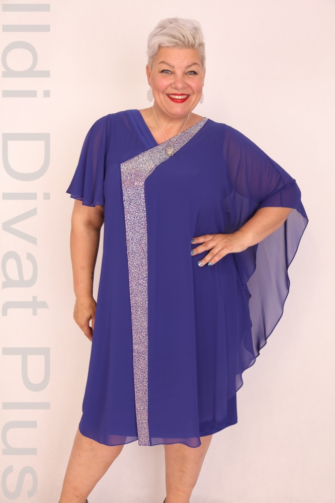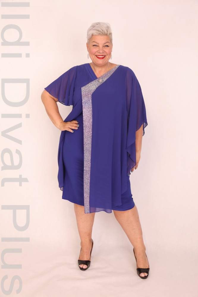 Baroslis királykék színű, V-kivágott, átlapolt, muszlin anyagú, strassz díszítéses, lezser fazonú ruha.