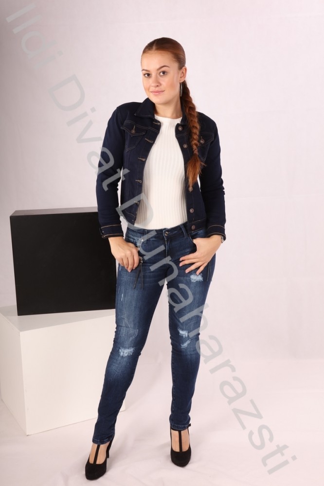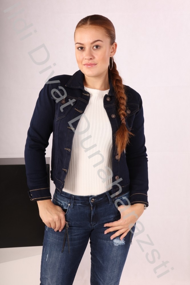 Basic sötétkék színű, mell részén zsebes, sportos farmer anyagú kabát.