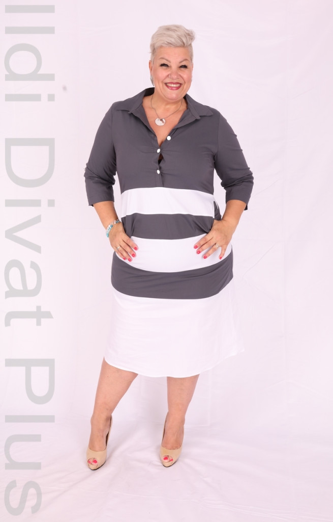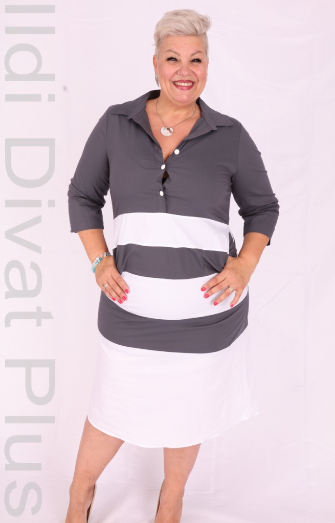 Szürke galléros nyakán gombos alján fehér csíkos A vonalú ingruha.