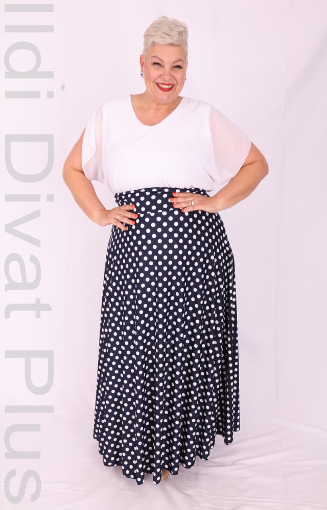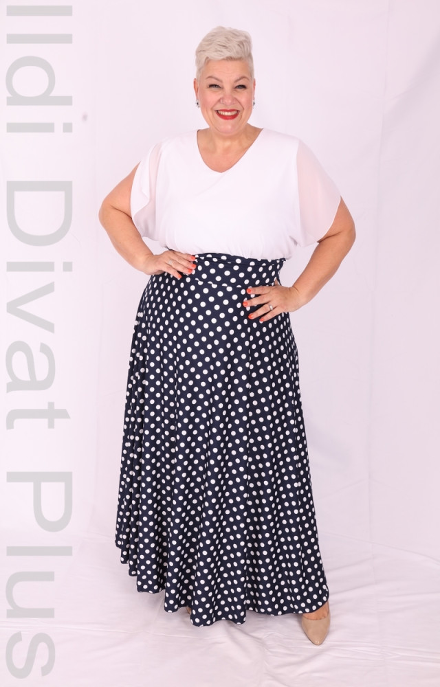 Kék alapon fehér pöttyös maxi szoknya.