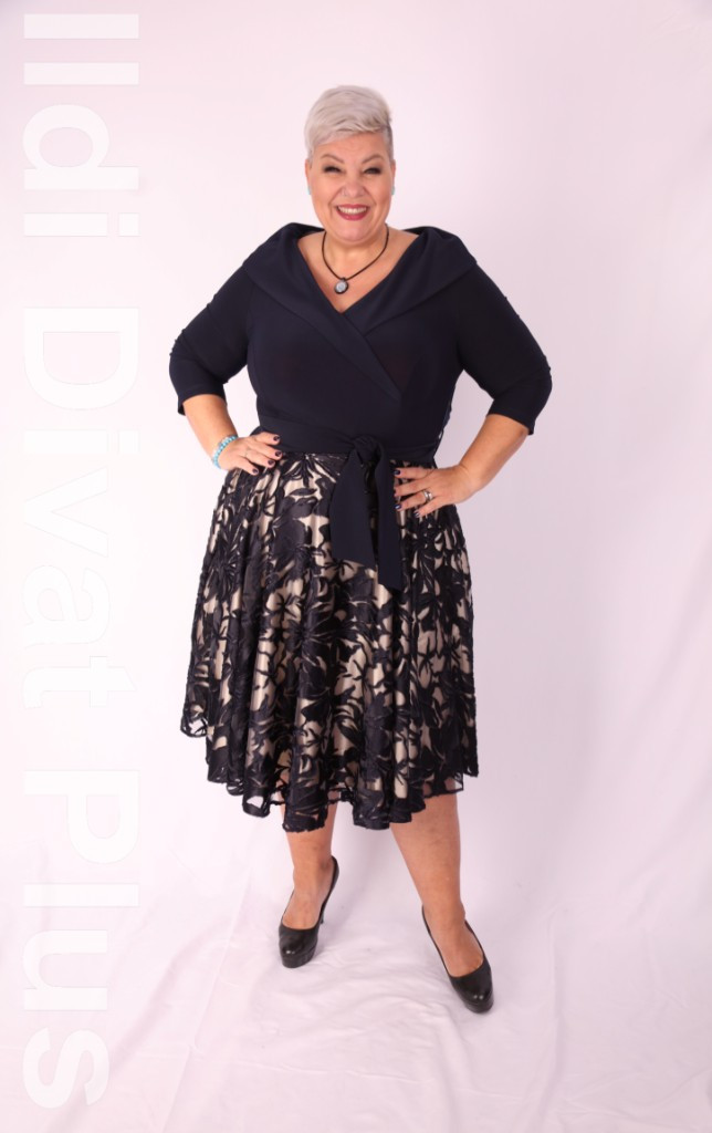 Benitta Kék vállra húzós alján arany és kék csipke betétes A vonalú ruha.