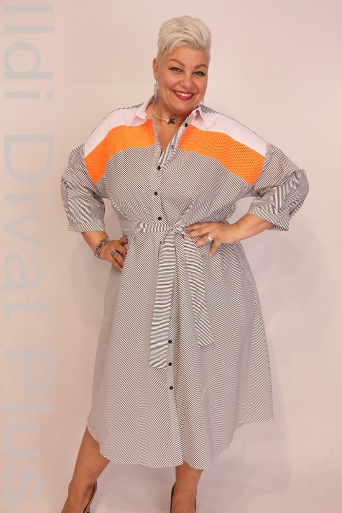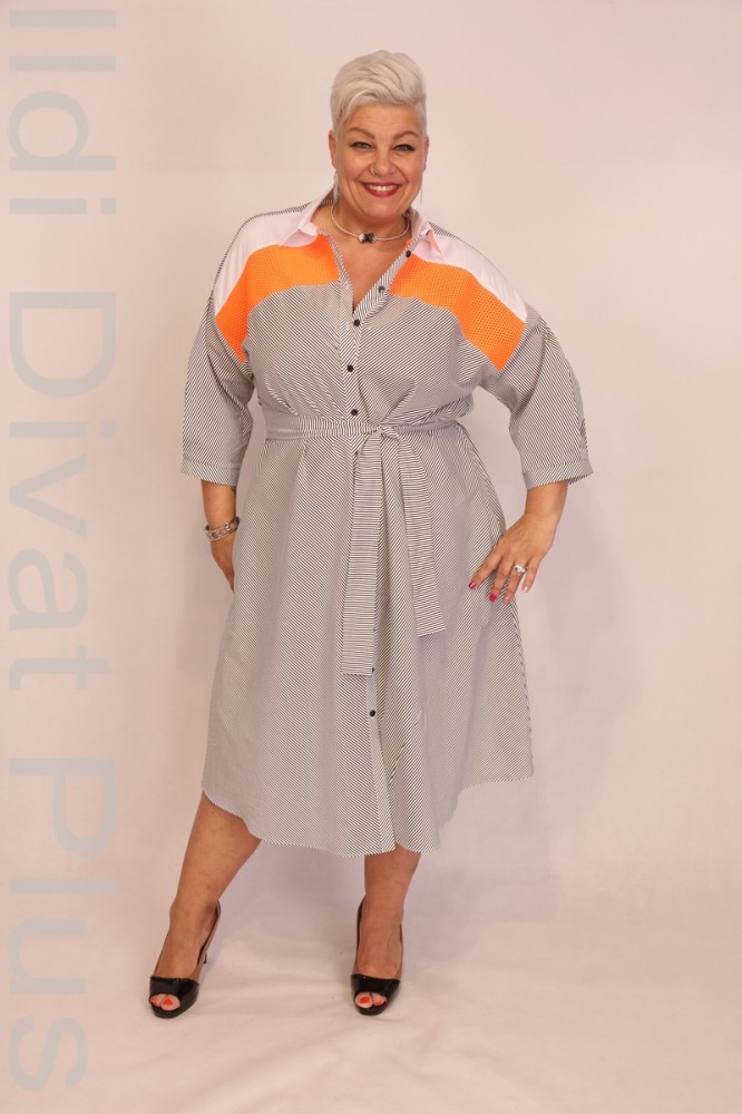 Biljana szürke-fehér színű, galléros, gombos, naracs betétes, derekán megkötős, enyhén lefellé bővülő fazonú ruha.