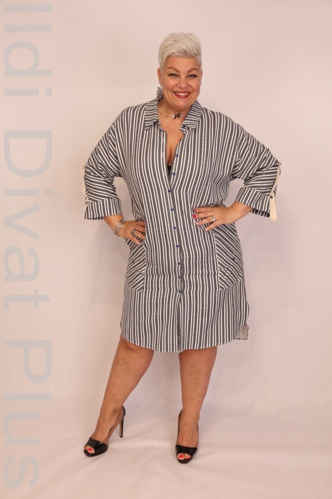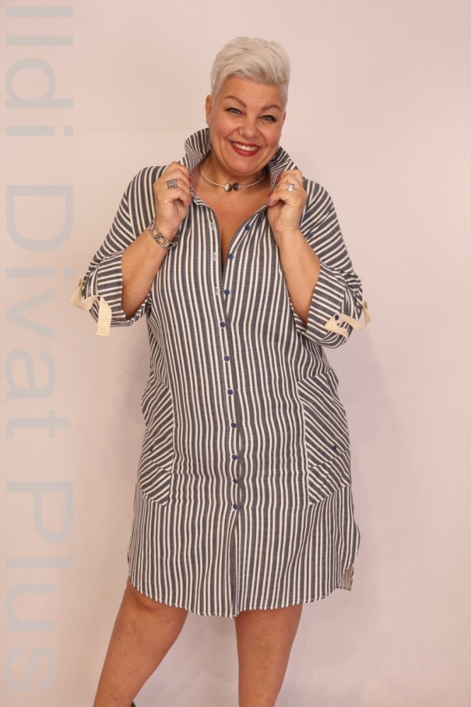 Biljana fehér-szürke színű, gombos, galléros, egyenes fazonú ruha.