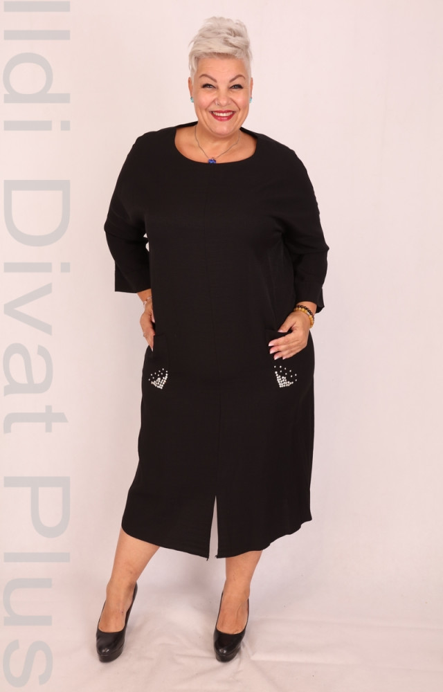 Biljana fekete színű, kerek nyakú, köves, zsebes, sliccelt, enyhén lefelé bővülő ruha.