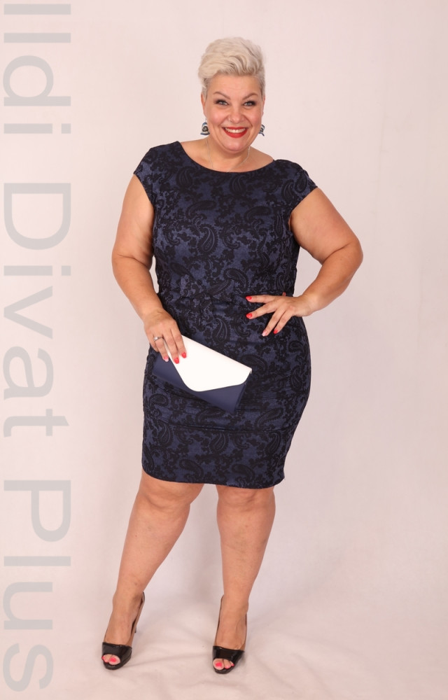Botega Elena sötétkék színű, kerek nyakú, anyagában mintás, karcsúsított fazonú ruha.
