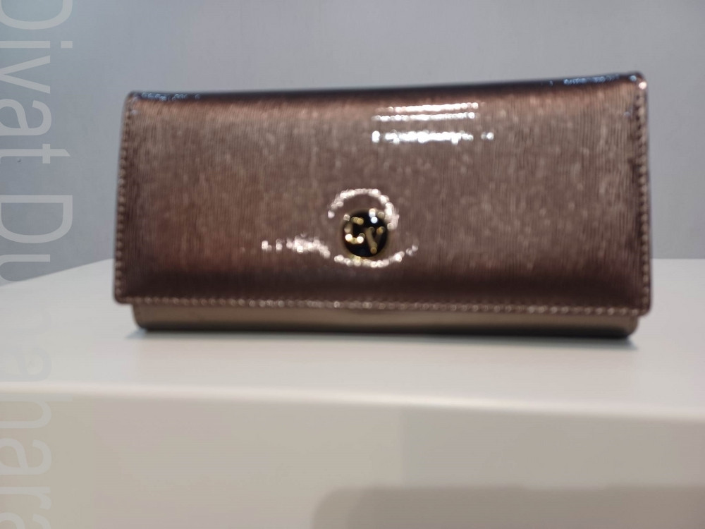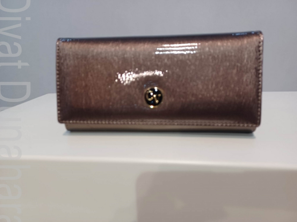 Mályva színű, csillogós, cipzáras és patentos bőr pénztárca.