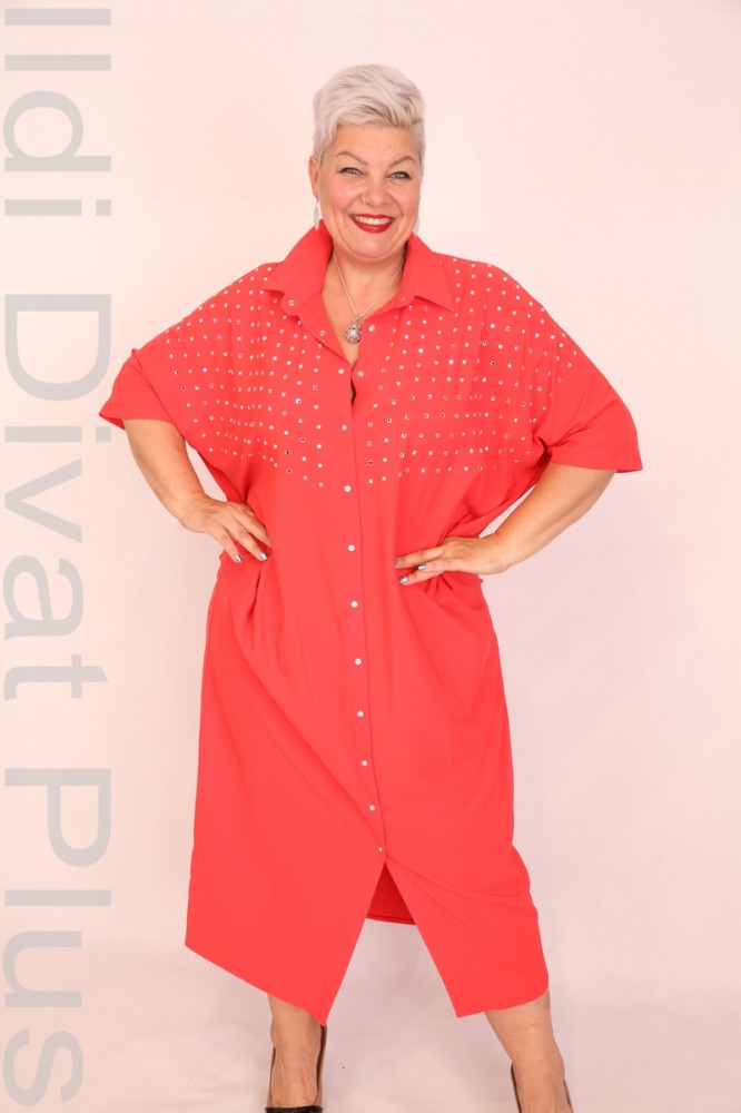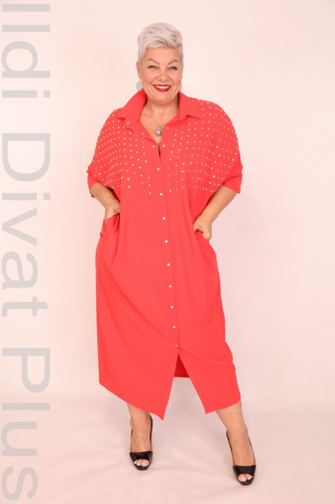 Cadrelli piros színű, kő díszítéses, galléros, sliccelt, egyenes fazonú ingruha.