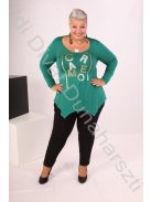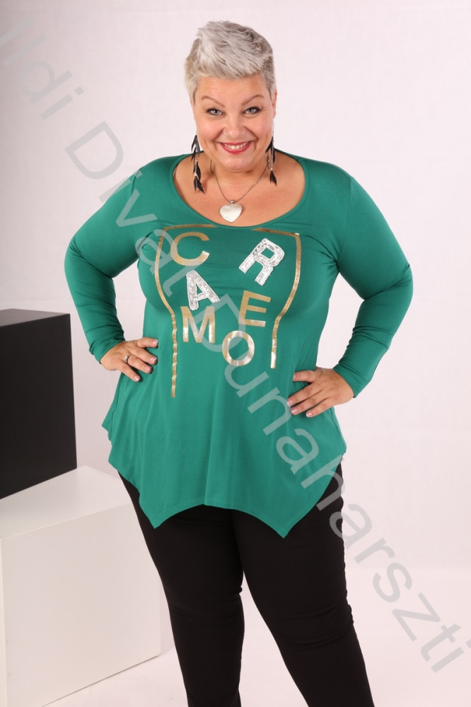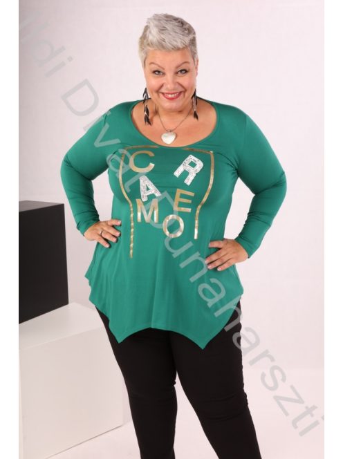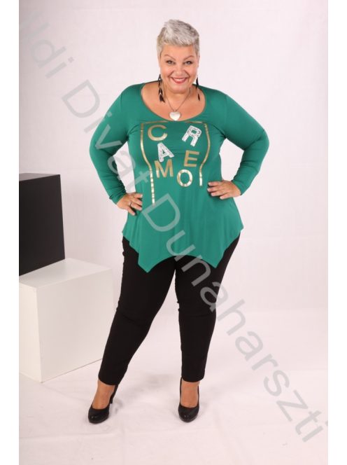 Caremo zöld színű, elején filmnyomott, hosszú ujjú, alján cikk-cakkos, karcsúsított fazonú felső.