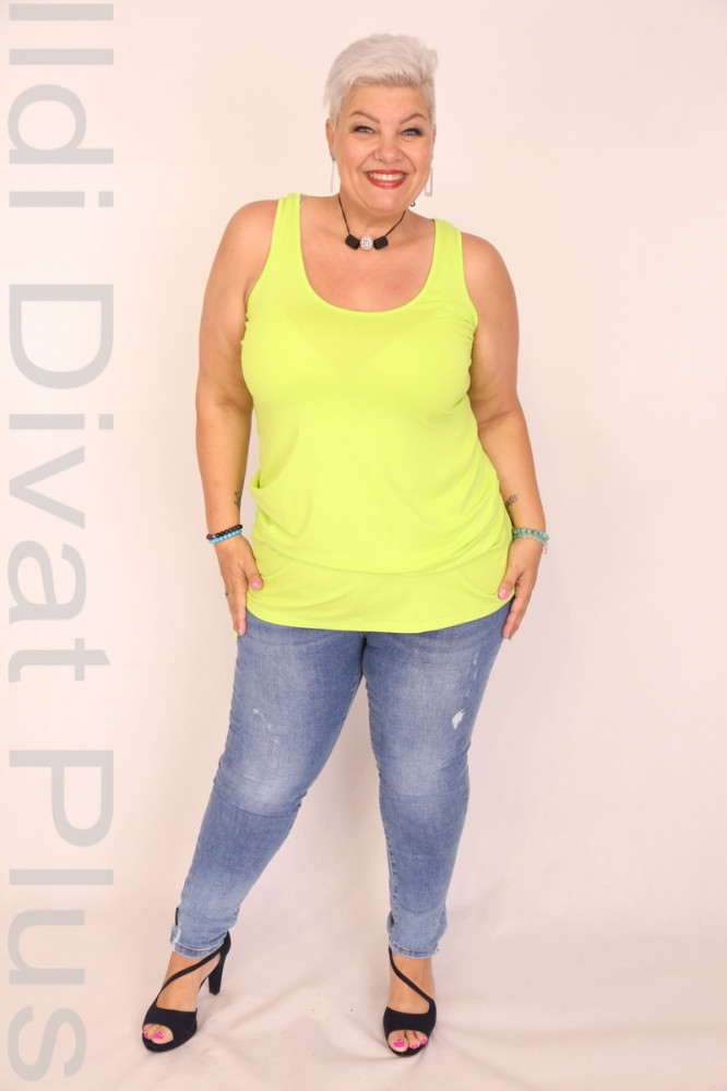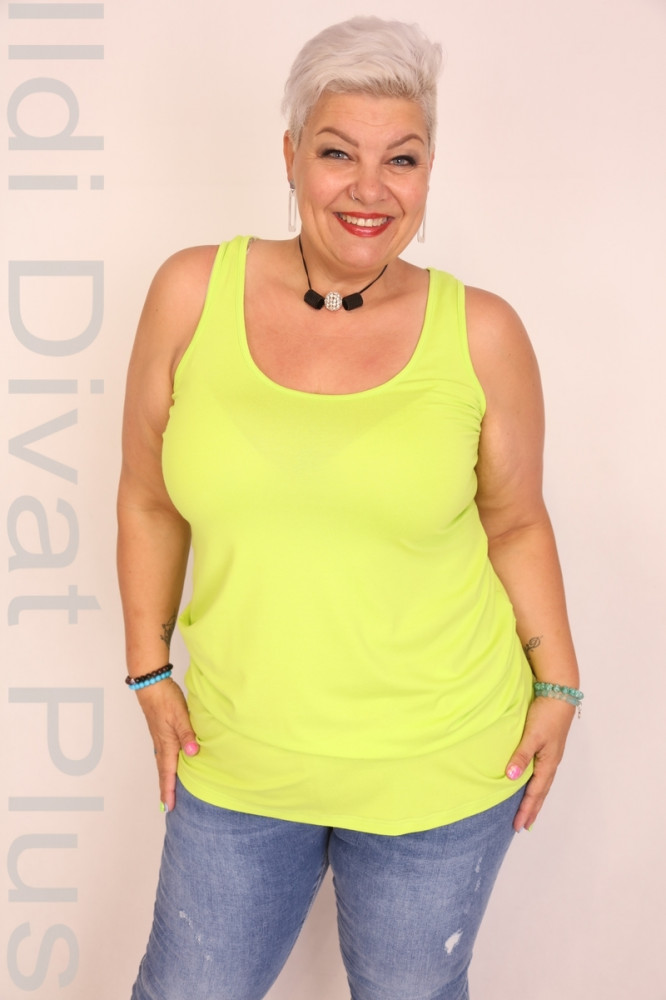 Caremo banánzöld színű, kerek nyakú, vastag pántos, hosszított fazonú trikó.