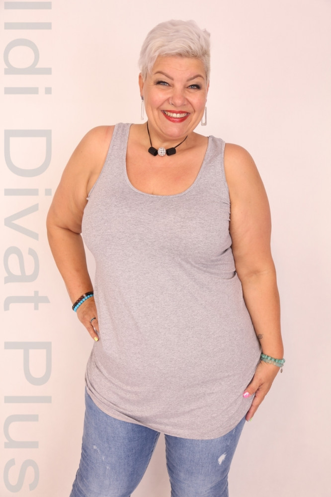 Caremo szürke színű, kerek nyakú, vastag pántos, hosszított fazonú trikó.