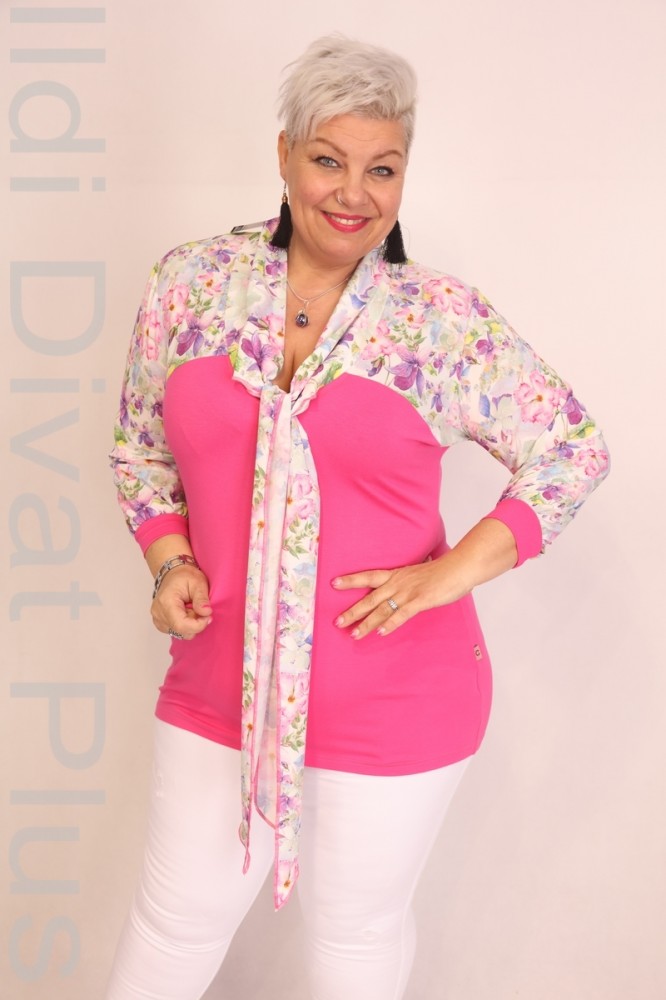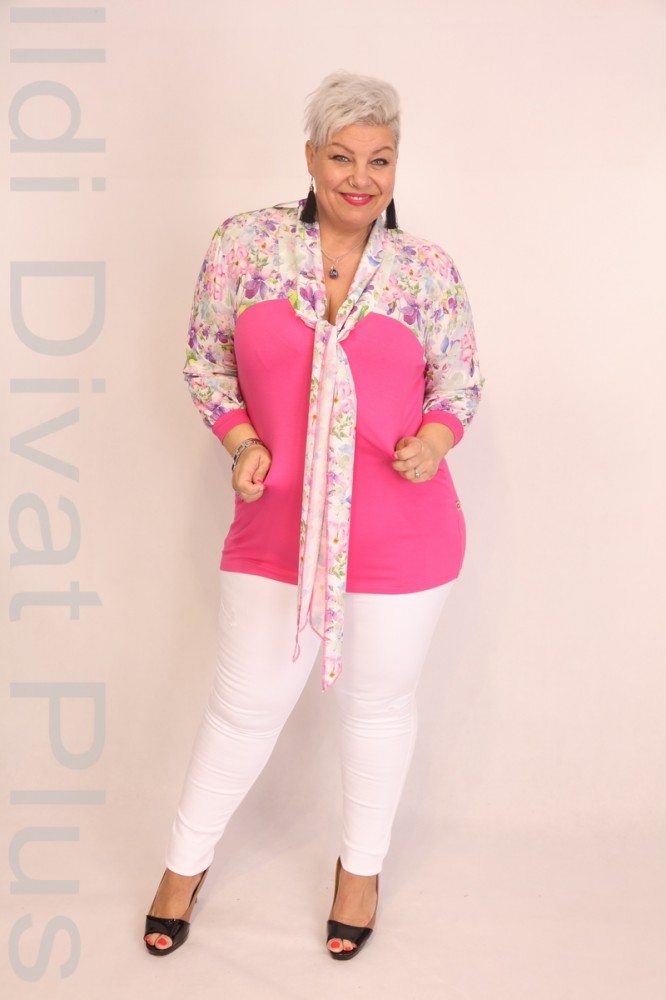 Caremo fehér alapon virágmintás alúl rószaszín, nyakrészén kivágott és megkötős, felső részén muszlinos anyagú, karcsósított fazonú blúz.