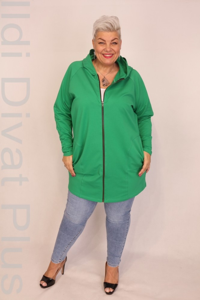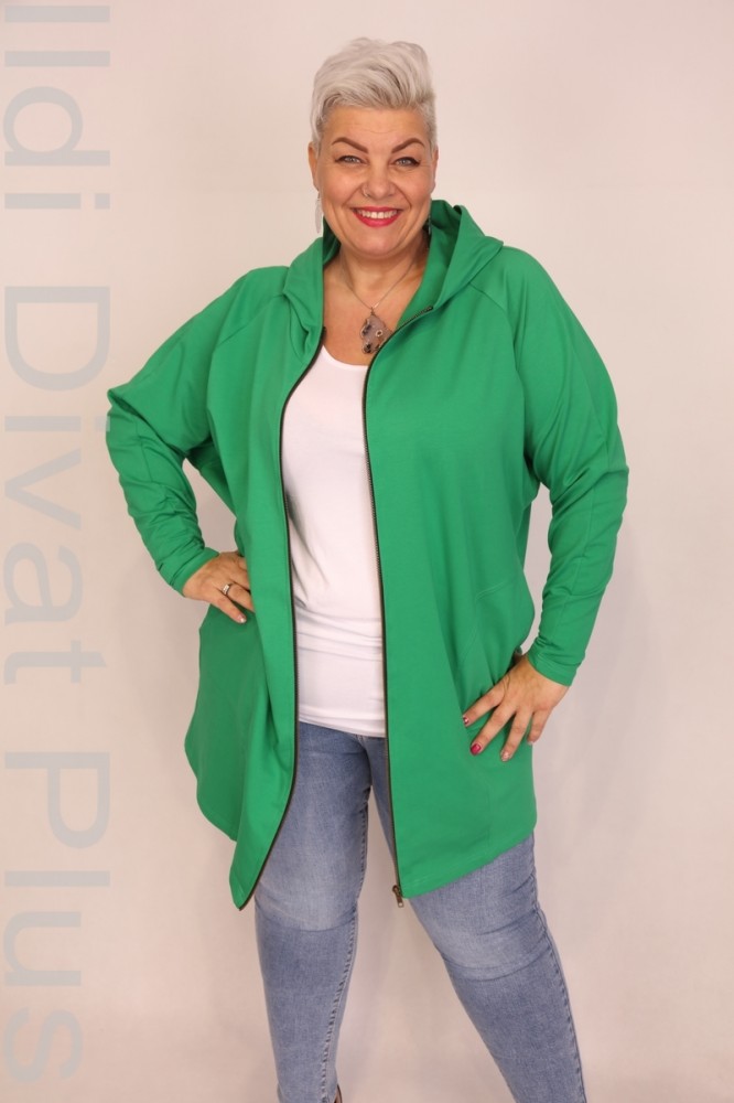 Caremo zöld színű, kapucnis, elején cibzáros, zsebes, lezser fazonú kardigán.
