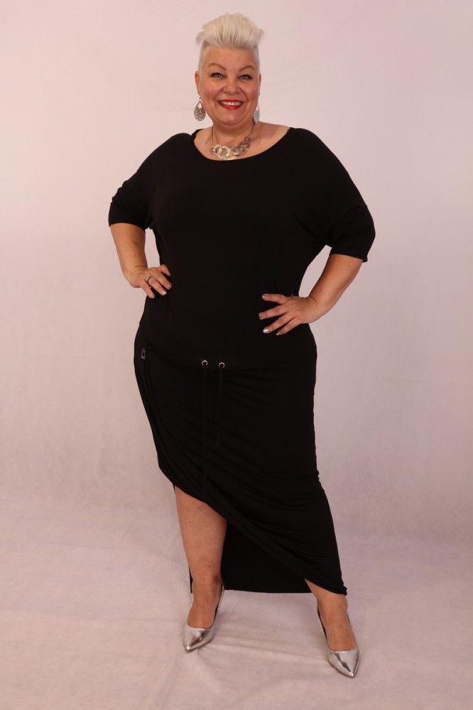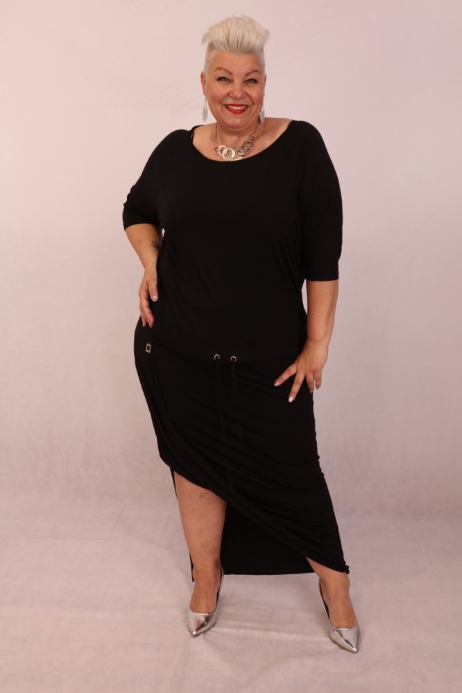 Caremo fekete színű, kerek nyakú, derék részén behúzós és megkötős, alján aszimmetrikus, lezser fazonú ruha.