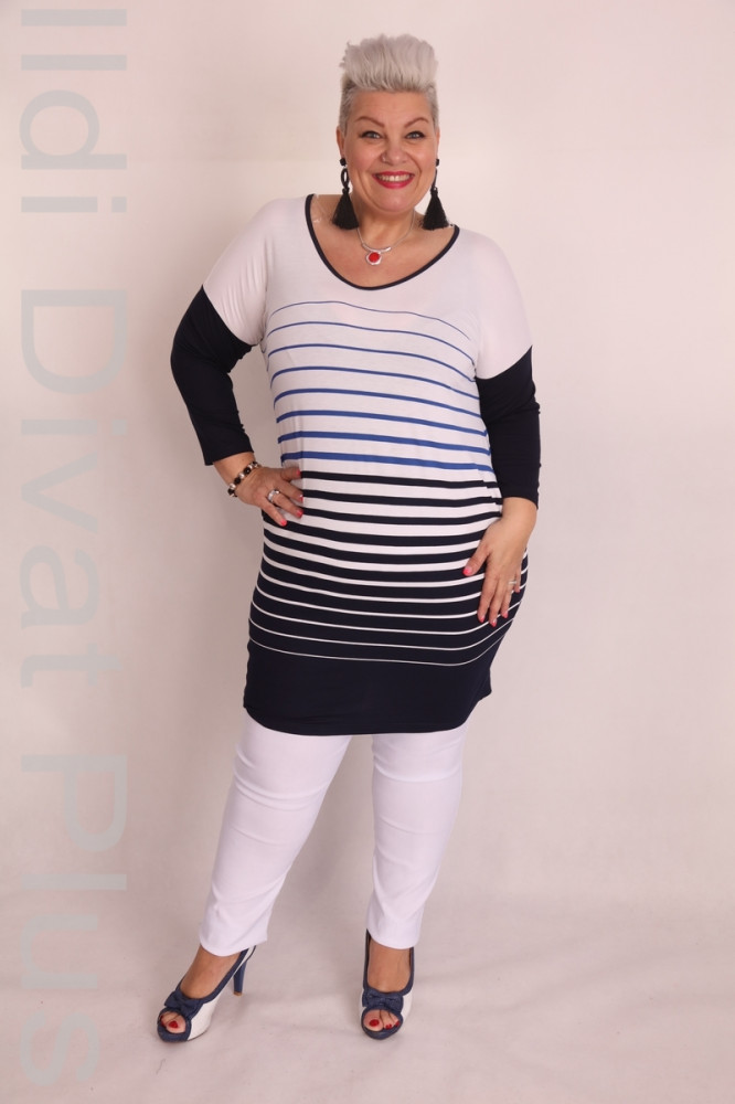 Caremo fehér alapon kék csíkos, kerekített V-kivágott, ujján passzés, lezser fazonú tunika.