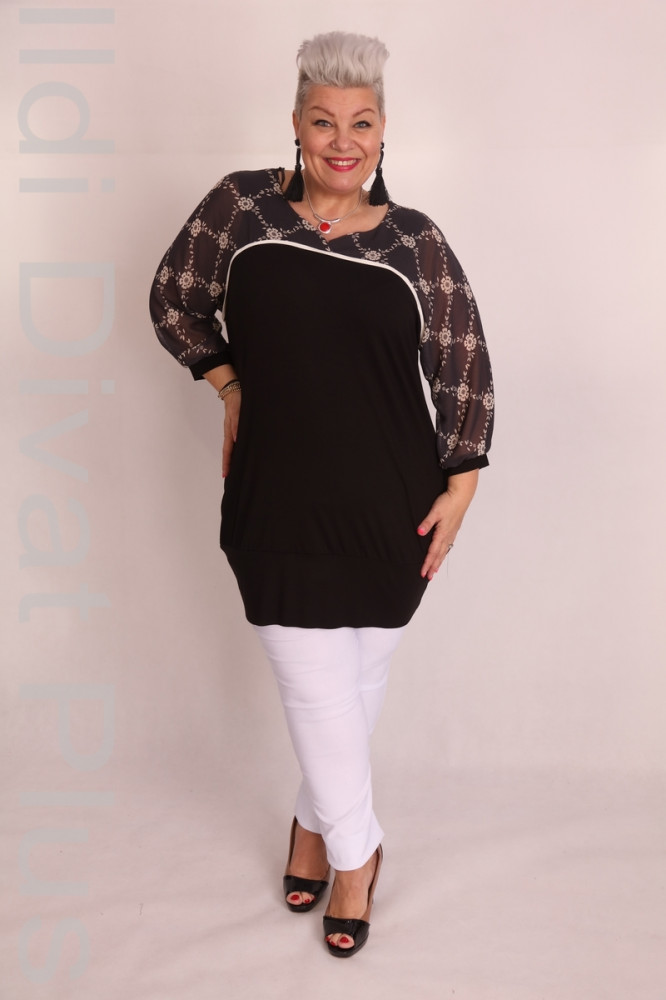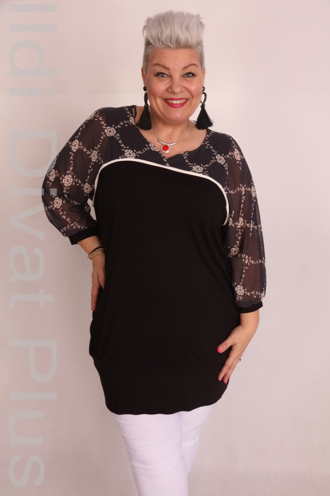 Caremo fekete alapon barna mintás, kerek nyakú, felső része és ujja muszlin anyagú, lezser fazonú tunika.