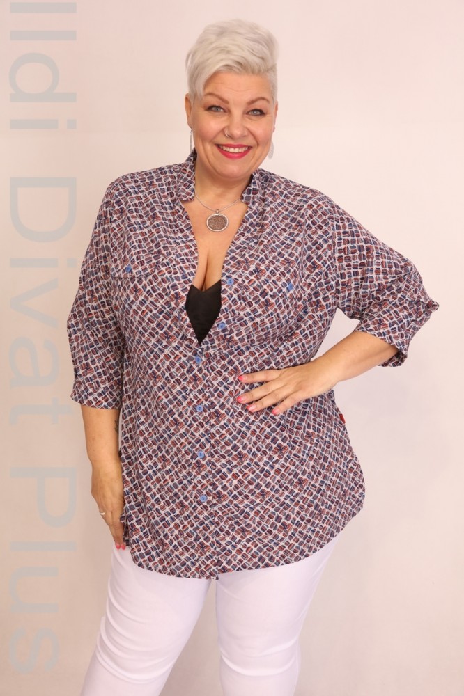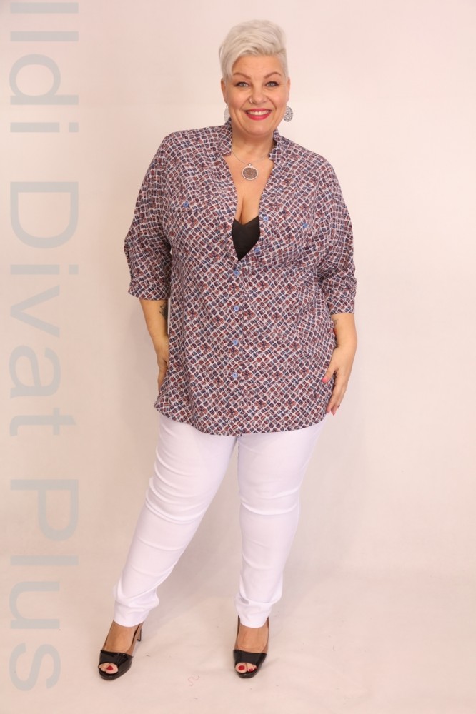 Caremo kék-barna mintás, álló nyakú, elején végig gombos, egyenes szabású és hosszított szabású ing.
