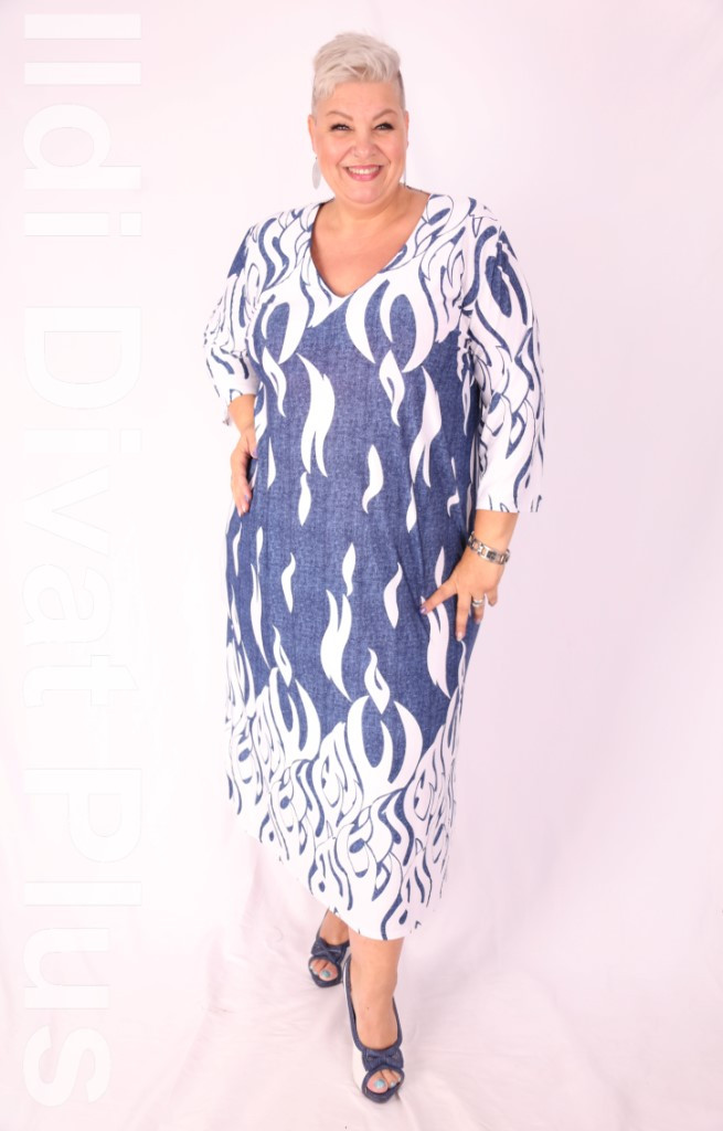 Classis világoskék alapon fehér anyagában mintás ruha.
