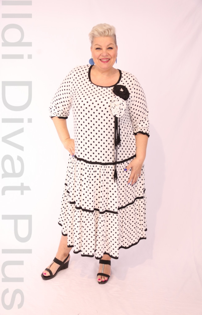 Darkwin fehér alapon fekete pöttyös fodros ruha.