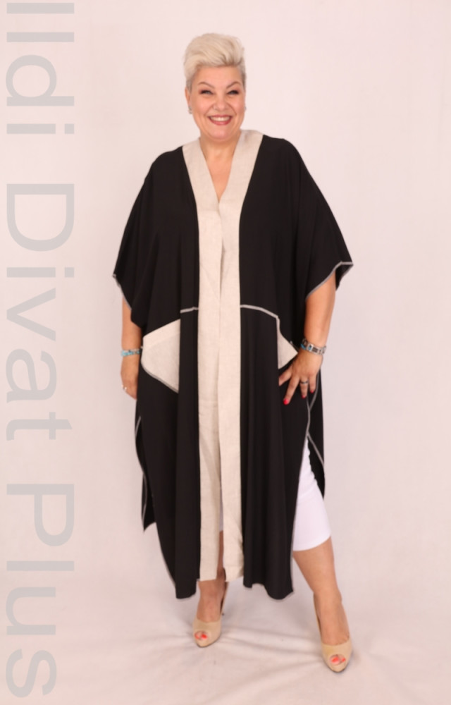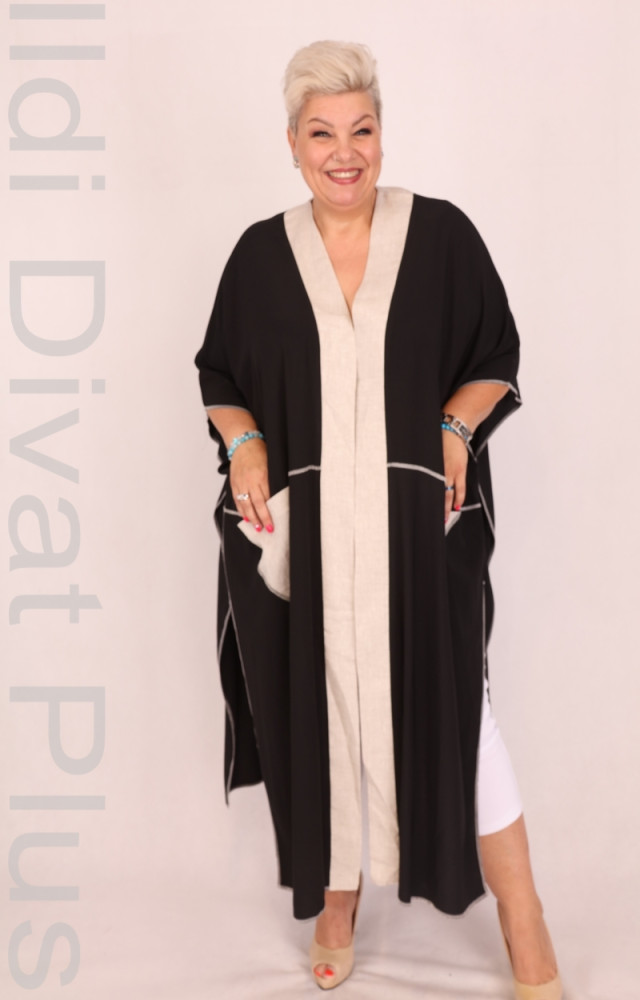 Fekete-beige színű, zsebes, lezser fazonú kardigán.