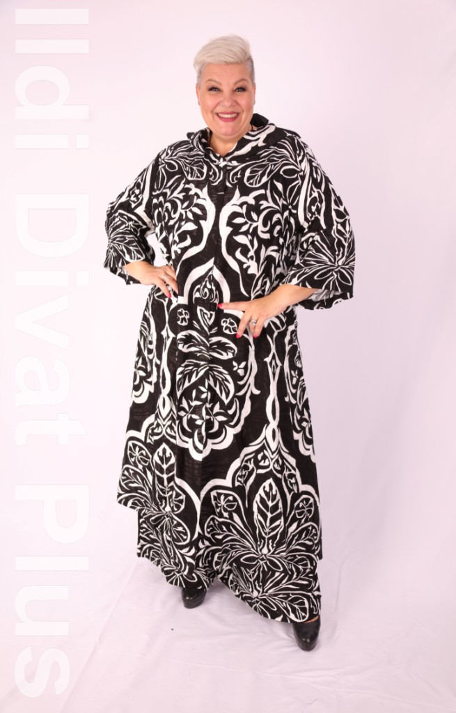 Darkwin fekete-fehér mintás gombos ingtunika+ fekete fehér mintás bőszárú nadrág.