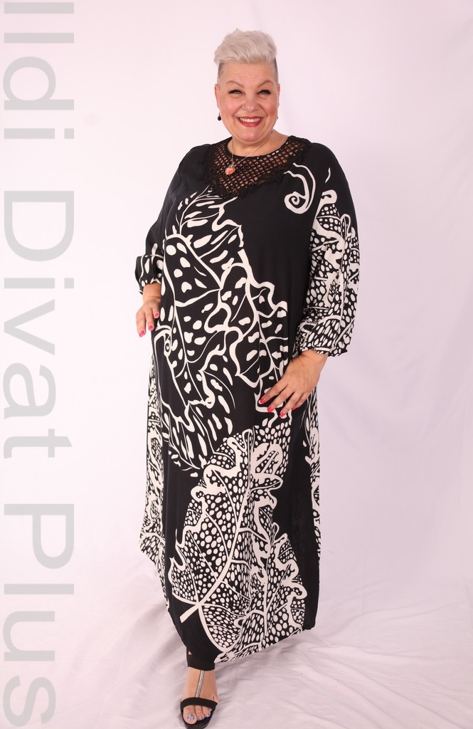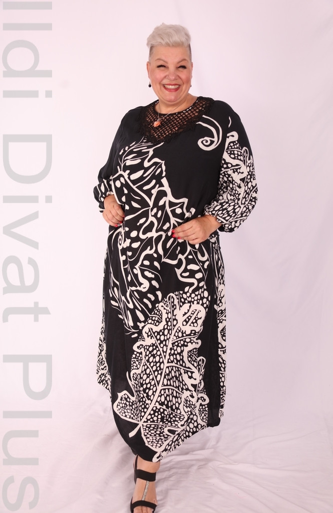 Darkwin fekete alapon fehér mintás nyakán madeirás gyöngyös ruha.
