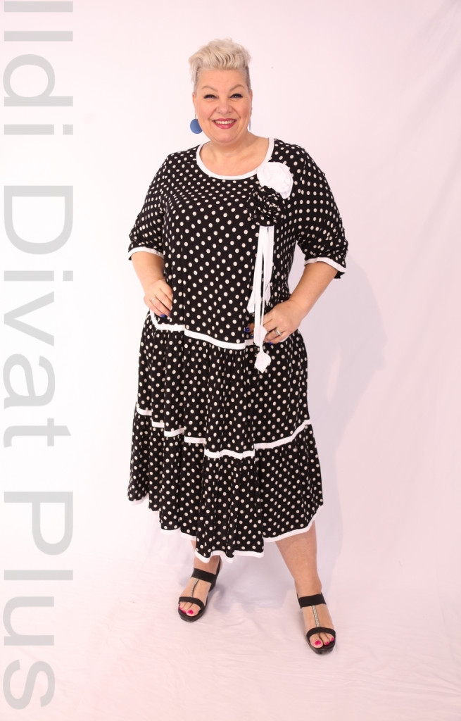 Darkwin fekete alapon fehér pöttyös fodros ruha.