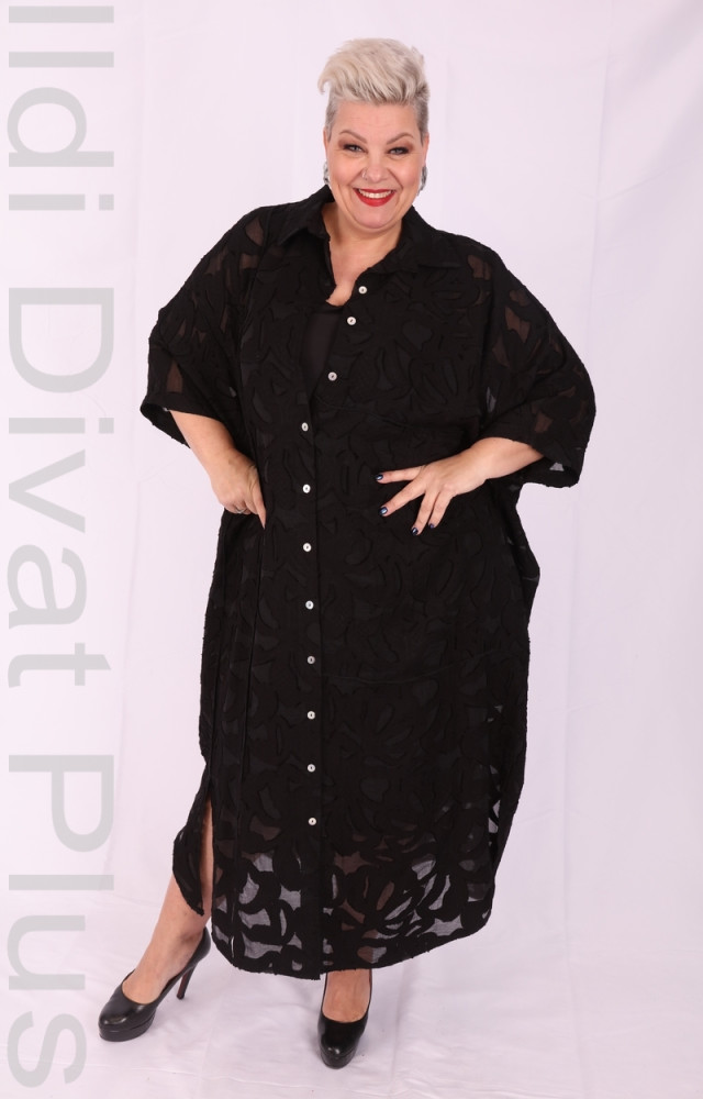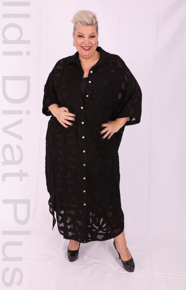 Darkwin fekete színű, V-kivágott, anyagában csipkés, gombos, galléros, egyenes fazonú ruha.