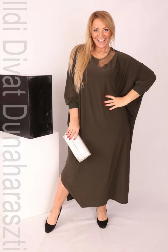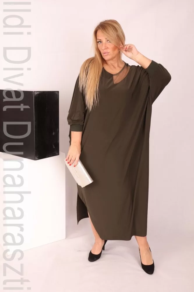 Darkwin khaki színű, kerek nyakú, vállán neccbetétes, lezser fazonú ruha.