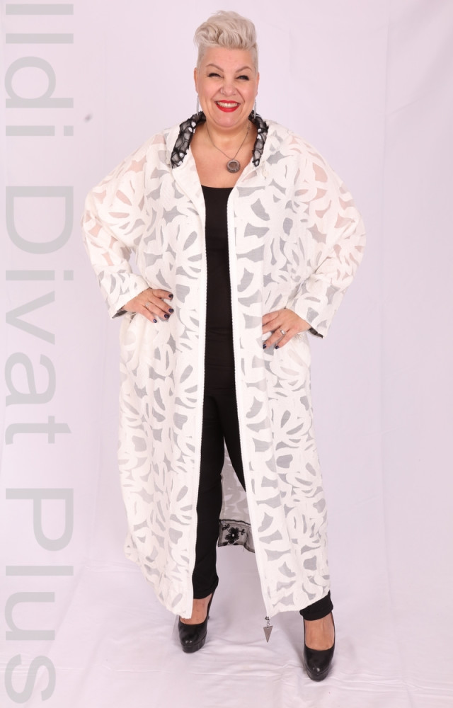 Fehér zippes kapucnis maxi csipke kardigán-kabát