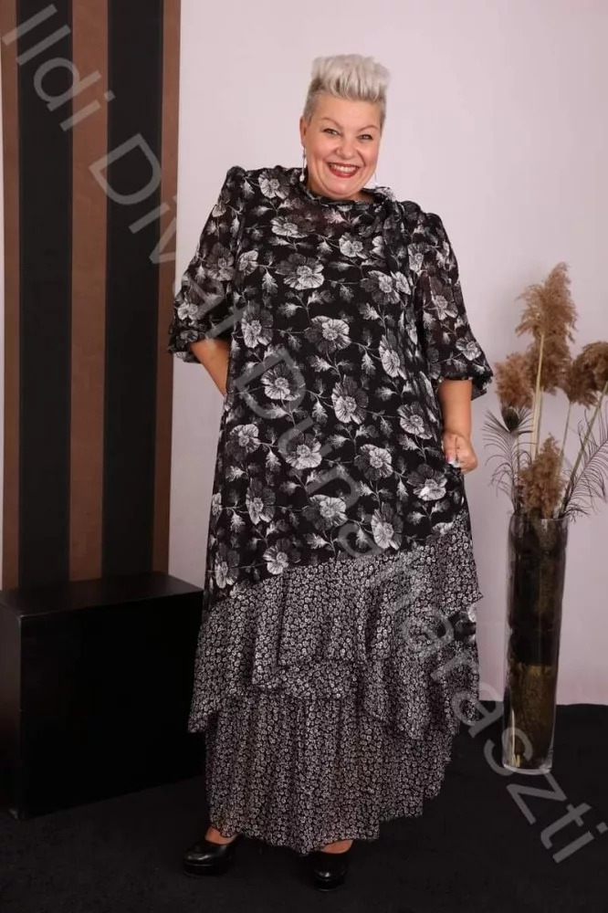 Darkwin fekete alapon virágmintás, fodros, lefelé bővülő fazonú ruha.