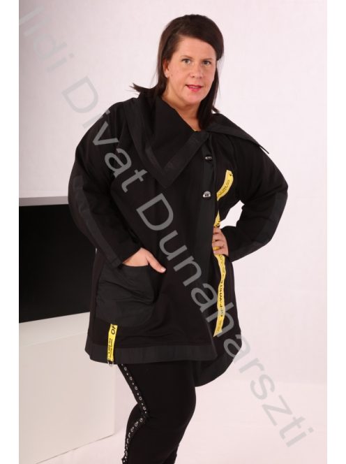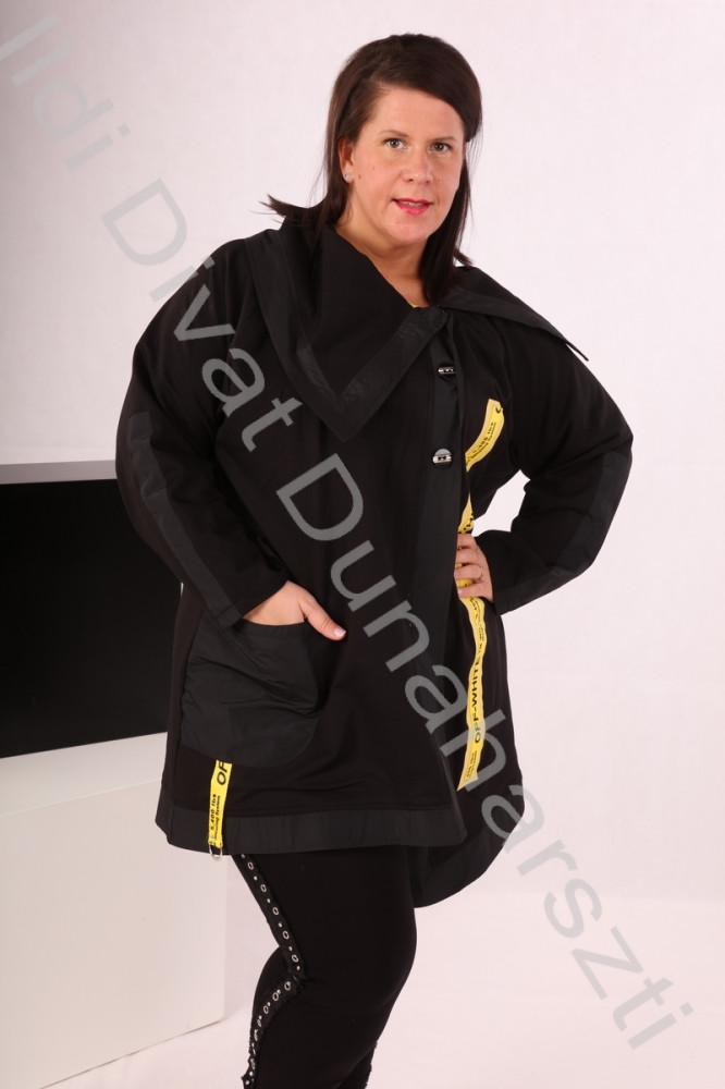 Fekete színű, sárga feliratos, hosszított galléros kabát.
