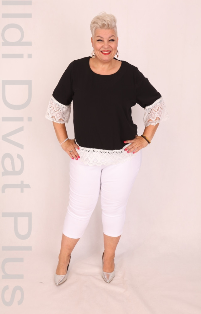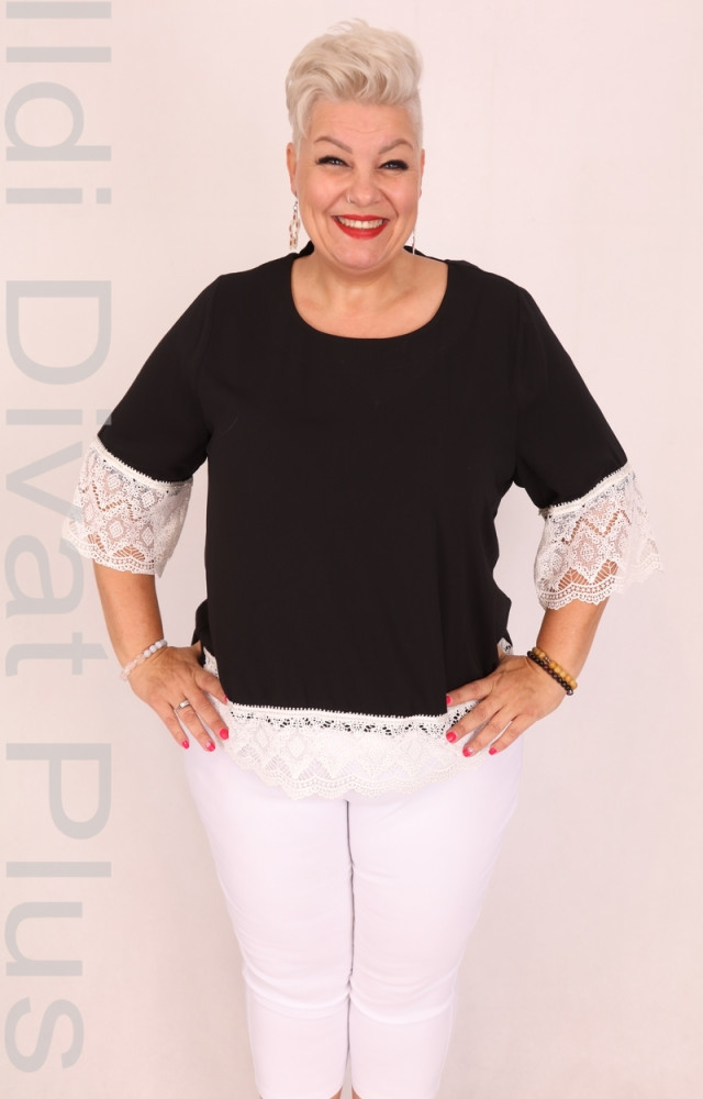 De Whites fekete-fehér színű, kerek nyakú, ujja végén és alján csipkés, lezser fazonú felső.
