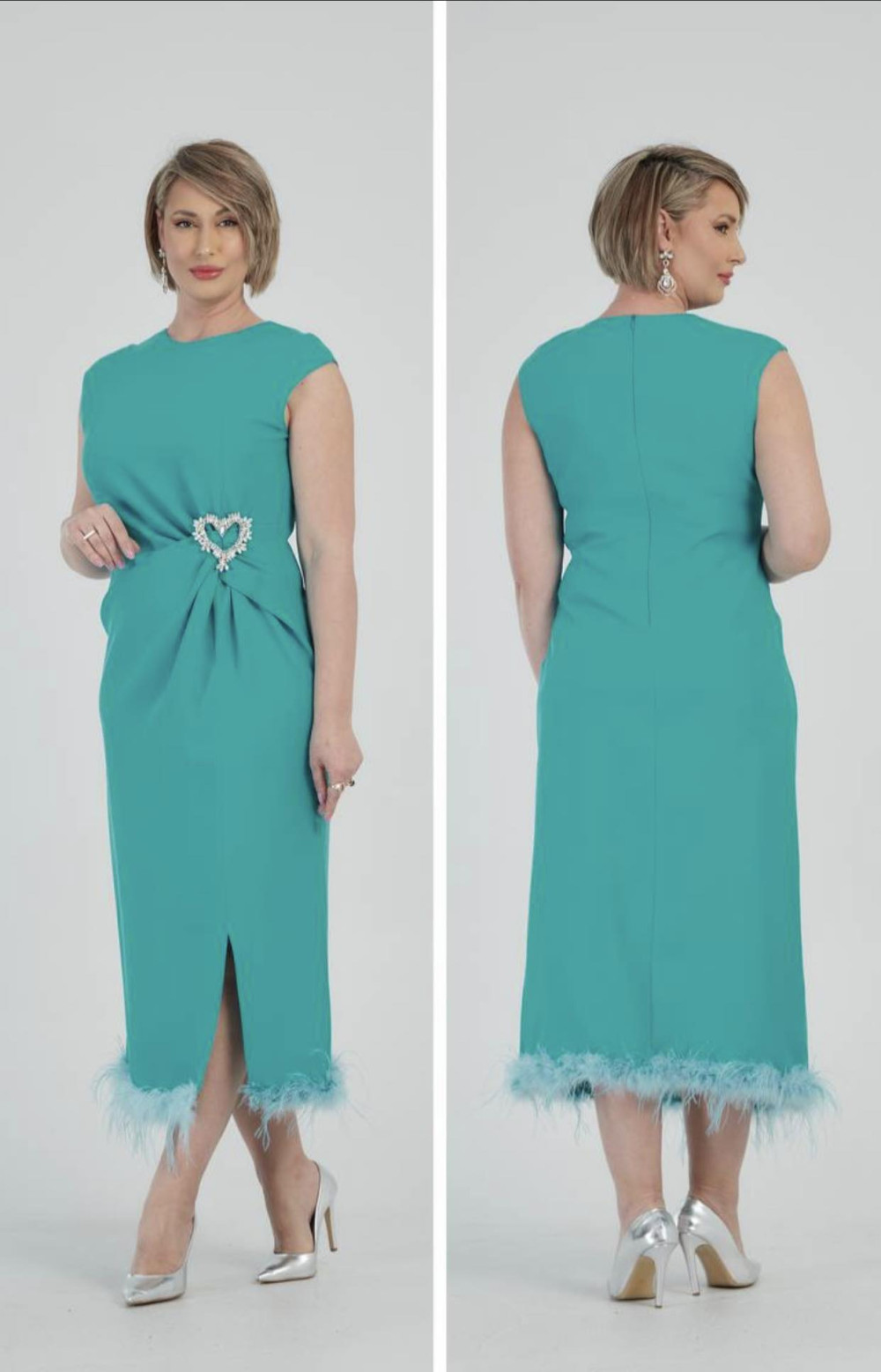Ella petrol színű, derék részen strasszos és tűzött, alján toll díszítéses, egyenes fazonú ruha.