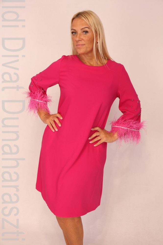 Ella pink színű, kerek nyakú, ujján strasszos és toll díszítéses, egyenes fazonú ruha.