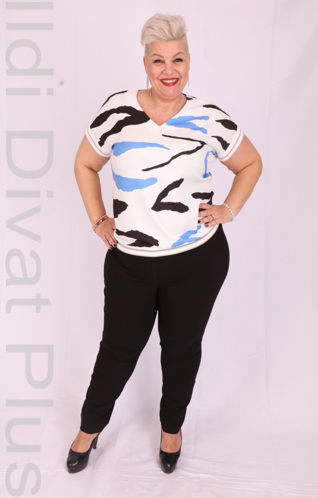 Emi ekrü alapon királykék-fekete mintás, V-kivágott, lezser fazonú felső.