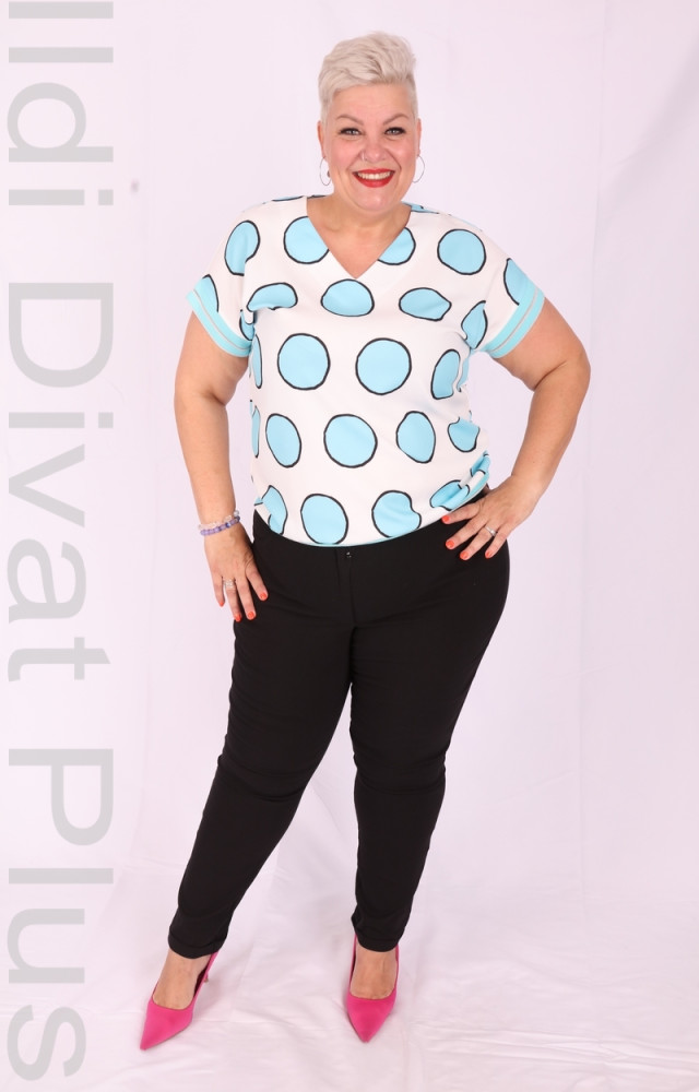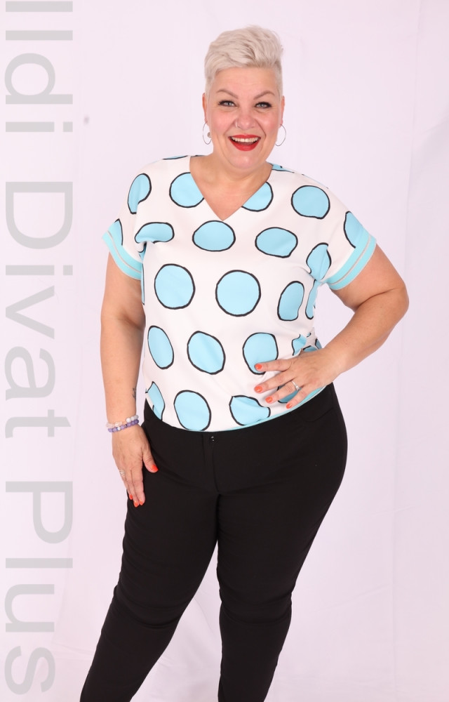 Emi fehér alapon türkiz pöttyös, V-kivágott, karcsúsított fazonú felső.