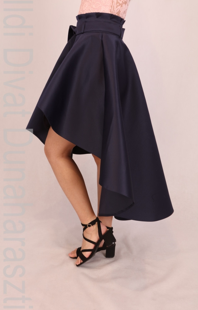 Envy Fashion sötétkék színű, merev anyagú, elől rövid, hátul hosszú, kötős derekú szoknya.