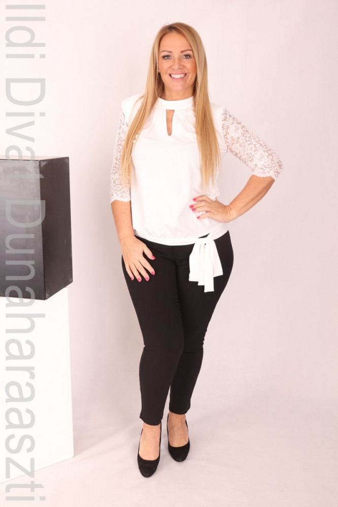 Exclusive fehér színű, V-kivágott, csipkés ujjú, kötős aljú, enyhén karcsúsított fazonú felső.