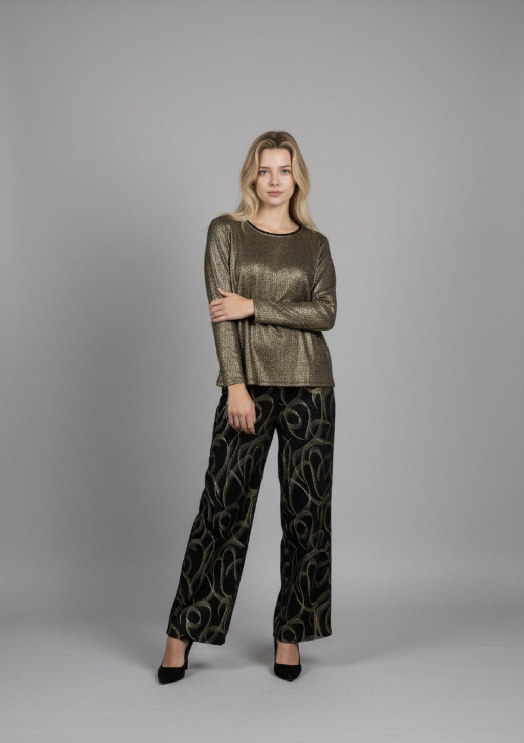 Frank Lyman arany csillogós kerek nyakú hosszú ujjú felső.