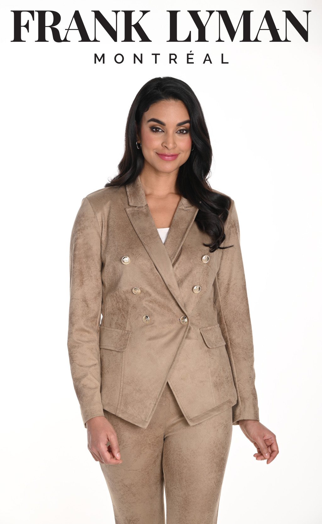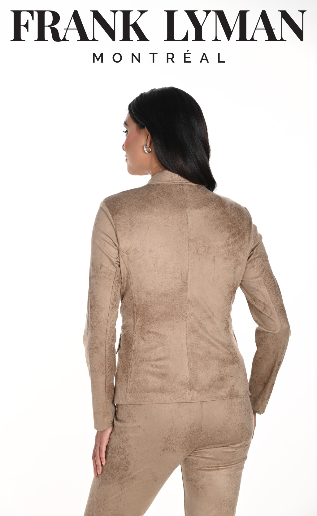 Frank Lyman barna színű, anyagában mintás, galléros, díszgombos és díszzsebes, karcsúsított fazonú blézer.